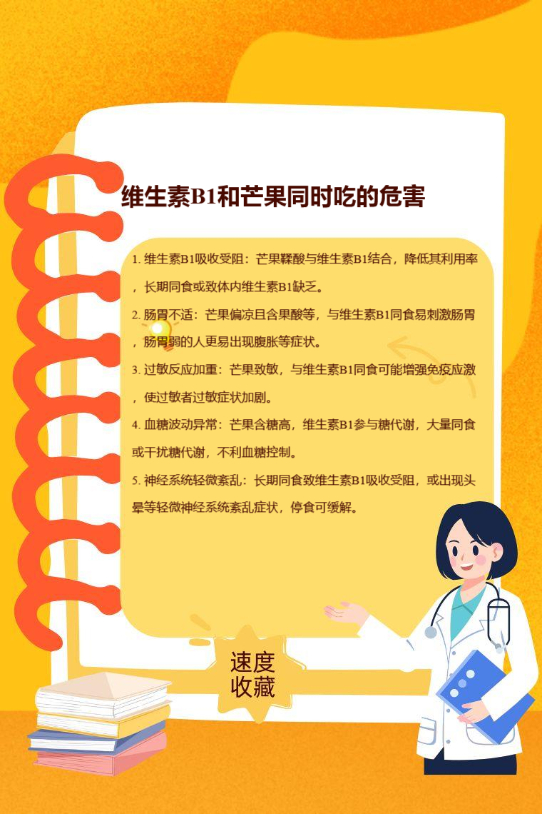 维生素B1与芒果同时食用可能导致维生素B1吸收受阻、肠胃不适、过敏反应加重、血糖波动异常、神经系统轻微紊乱等危害。