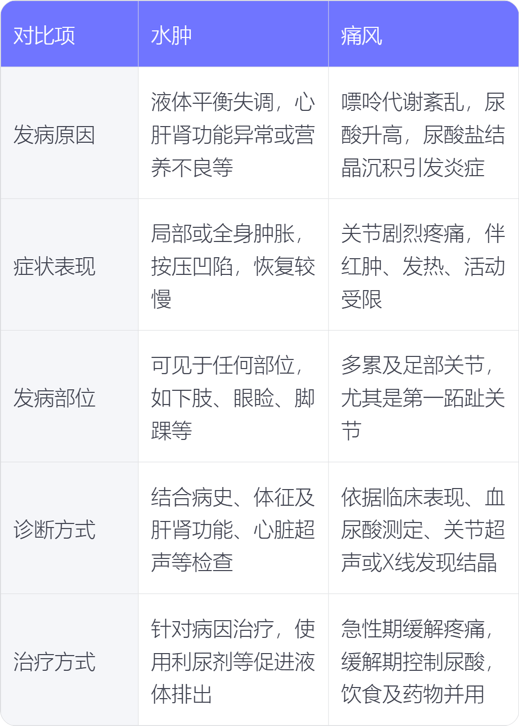 水肿和痛风在发病原因、症状表现、发病部位、诊断方式、治疗方式上存在不同。