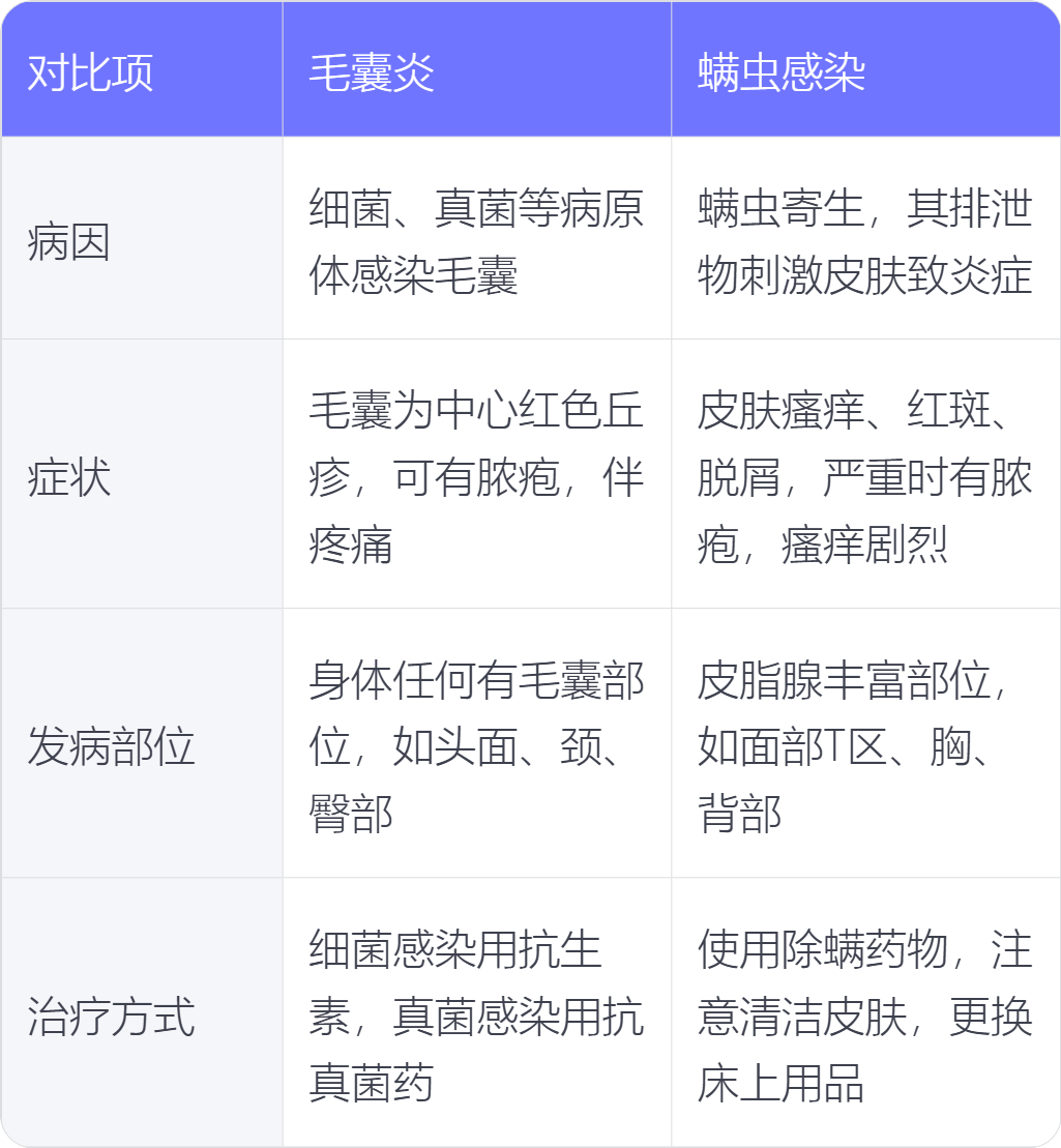 毛囊炎和螨虫感染在病因、症状、发病部位、治疗方式上存在不同。
