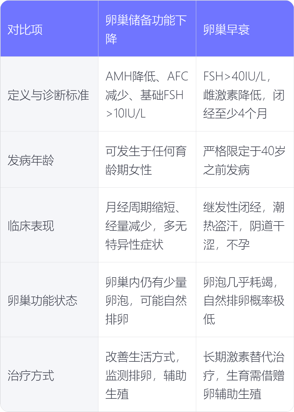 卵巢储备功能下降与卵巢早衰均为卵巢功能相关问题,但在定义与诊断标准、发病年龄、临床表现、卵巢功能状态、治疗方式方面存在不同。