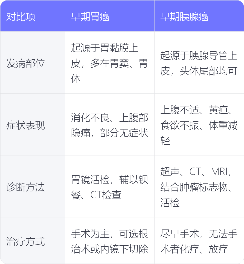 早期胃癌和早期胰腺癌在发病部位、症状表现、诊断方法、治疗方式上存在不同。
