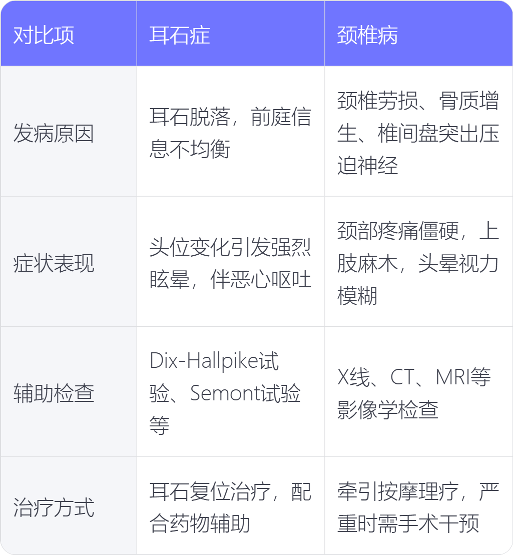 4. 治疗方式:耳石症以耳石复位治疗为主,配合药物辅助治疗;颈椎病治疗方法多样,轻度患者可通过牵引、按摩、理疗等保守治疗,严重时可能需手术干预。