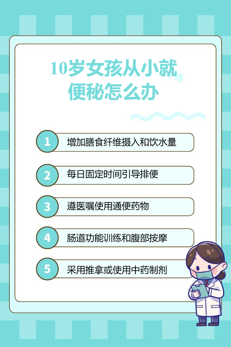 10岁女孩从小便秘可通过饮食结构调整、规律排便习惯培养、遵医嘱使用通便药物、肠道功能训练、中医辅助调理等方法改善。