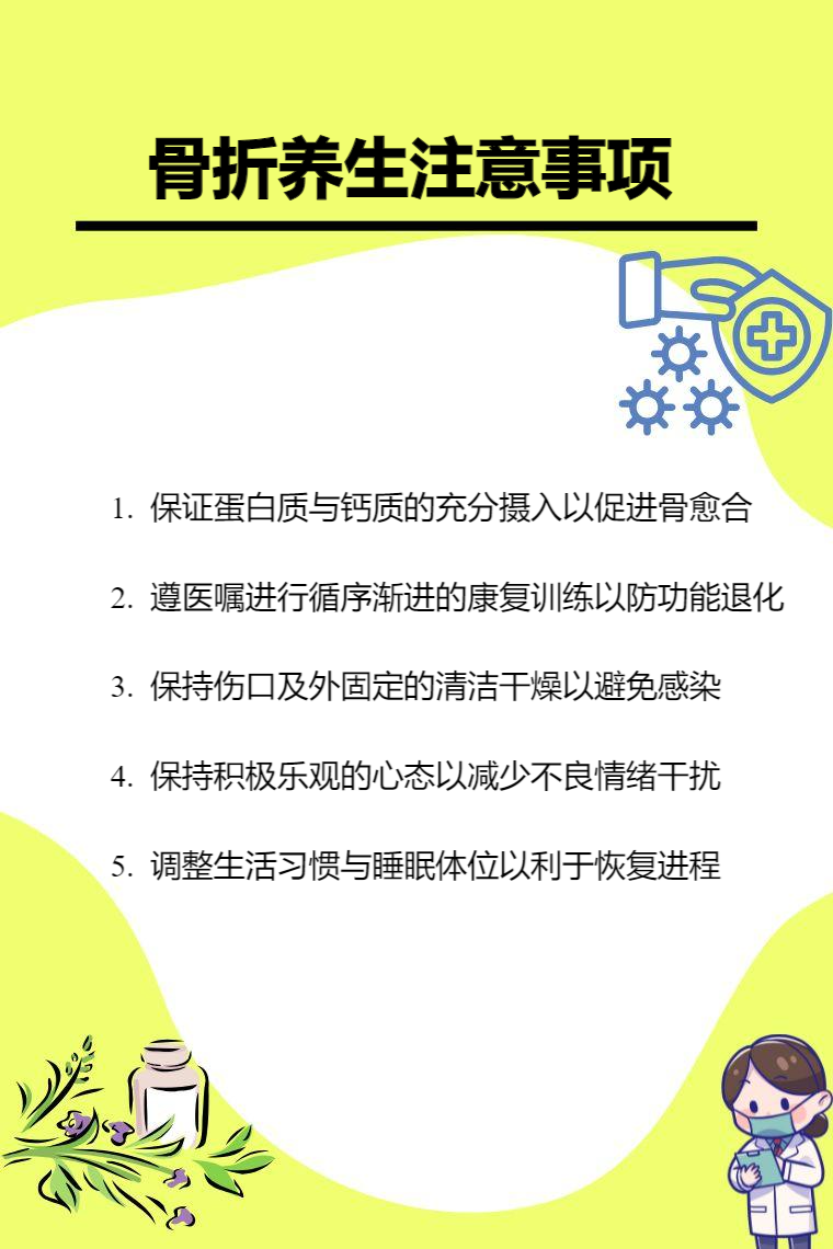 骨折养生需注意多方面,如饮食营养、康复训练、伤口护理、心理调节、生活习惯等。