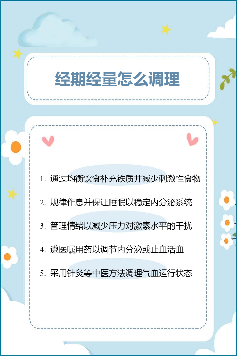 经期经量调理可通过饮食调理、作息调整、情绪管理、药物干预、中医理疗等方式实现。