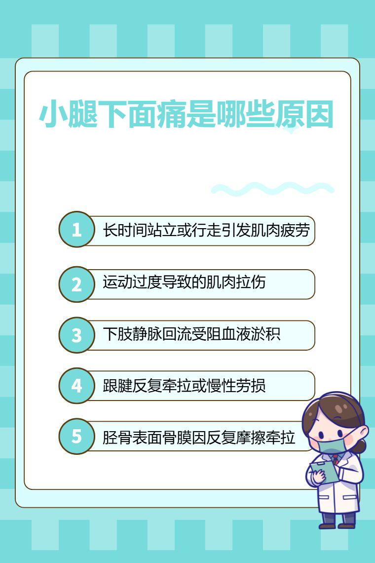 小腿下面痛可能与长时间站立或行走、运动过度、下肢血液循环不畅、跟腱炎、胫骨骨膜炎等有关。