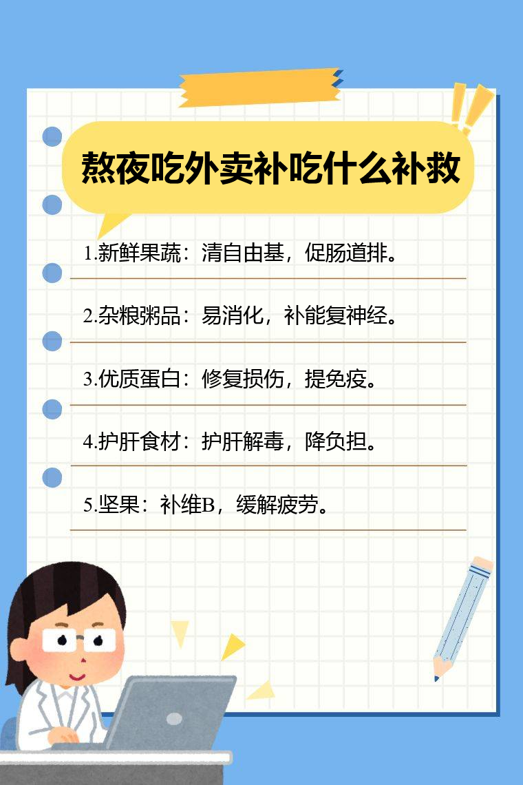 熬夜吃外卖后可通过补充新鲜果蔬、杂粮粥品、优质蛋白食物、护肝类药食同源食材、富含B族维生素的坚果等进行补救。