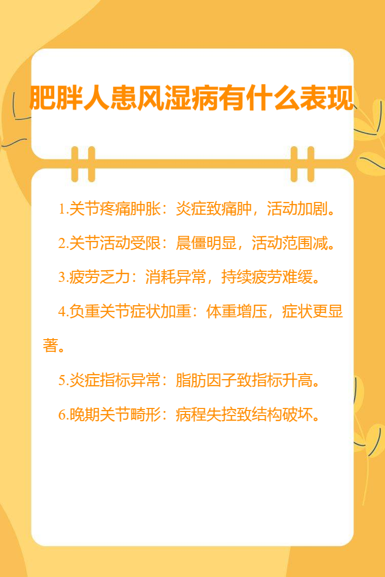 肥胖人群患风湿病后可出现关节疼痛肿胀、关节活动受限、疲劳乏力、体重负荷关节症状加重、炎症指标异常升高、关节畸形晚期罕见等表现。