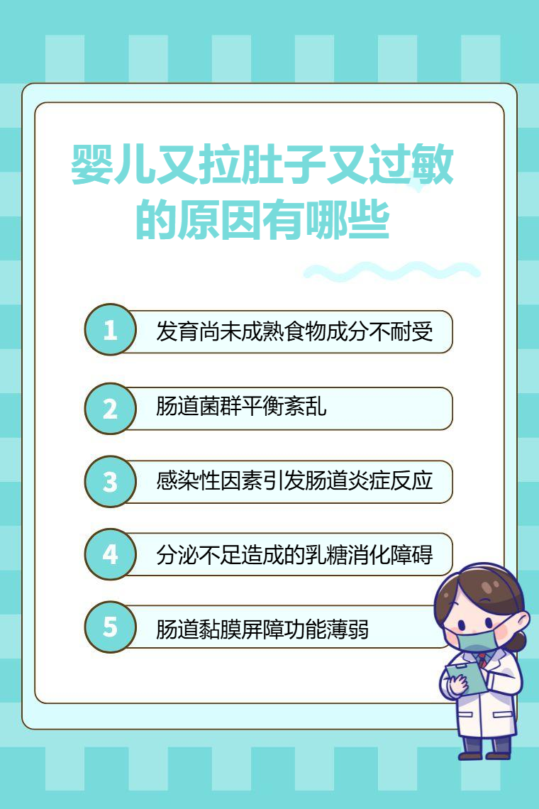 婴儿同时出现腹泻与过敏症状,多与食物不耐受、肠道菌群失调、肠道炎症反应、乳糖不耐受、功能不完善等有关。