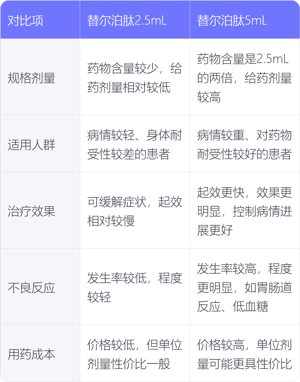 替尔泊肽2.5mL和5mL在规格剂量、适用人群、治疗效果、不良反应和用药成本方面存在不同。