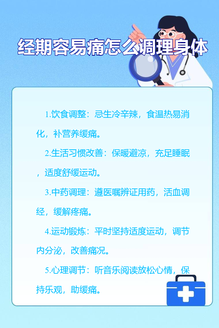 经期容易痛可通过饮食调整、生活习惯改善、中药调理、运动锻炼、心理调节等进行身体调理。