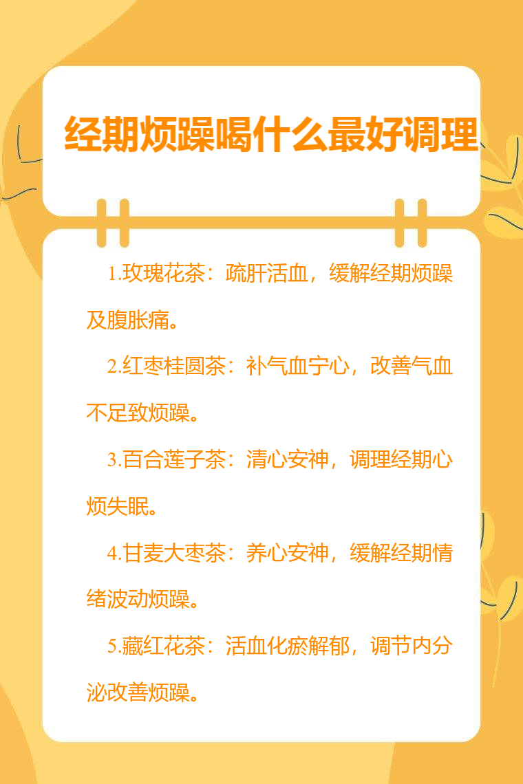 经期烦躁可通过喝玫瑰花茶、红枣桂圆茶、百合莲子茶、甘麦大枣茶、藏红花茶等来调理。