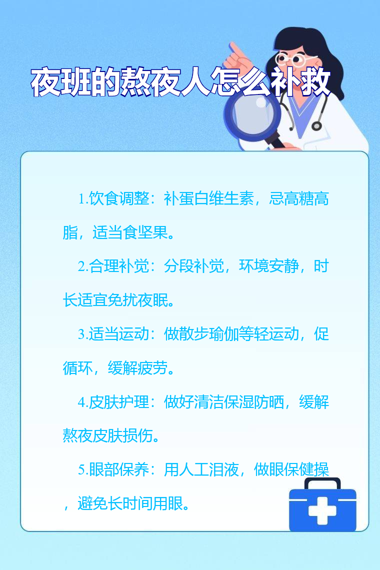 夜班熬夜后可通过饮食调整、合理补觉、适当运动、皮肤护理、眼部保养等补救。