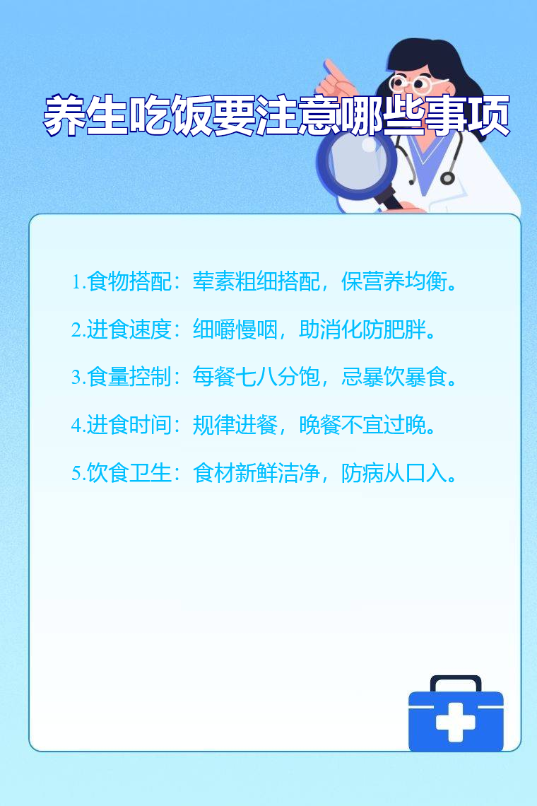 养生吃饭需注意食物搭配、进食速度、食量控制、进食时间、饮食卫生等。