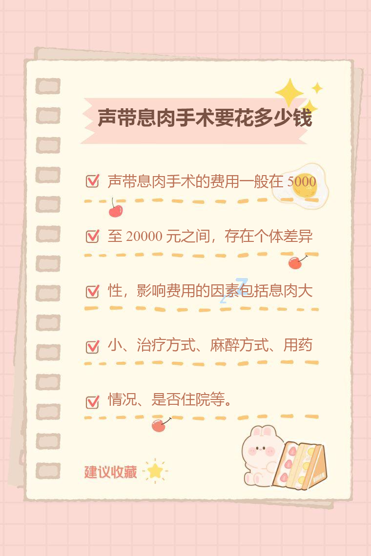 声带息肉手术的费用因多种因素而异,一般在 5000 元至 20000 元之间,存在个体差异性,影响费用的因素包括息肉大小、治疗方式、麻醉方式、用药情况、是否住院等。