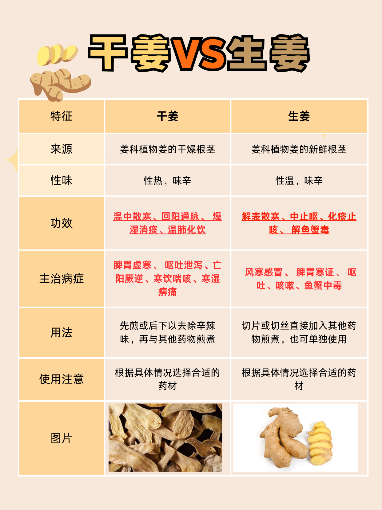 总之,干姜和生姜虽然都是姜科植物姜的根茎,但它们在来源、功效和用法上还是有一些区别的。在使用时,需要根据具体情况选择合适的药材。