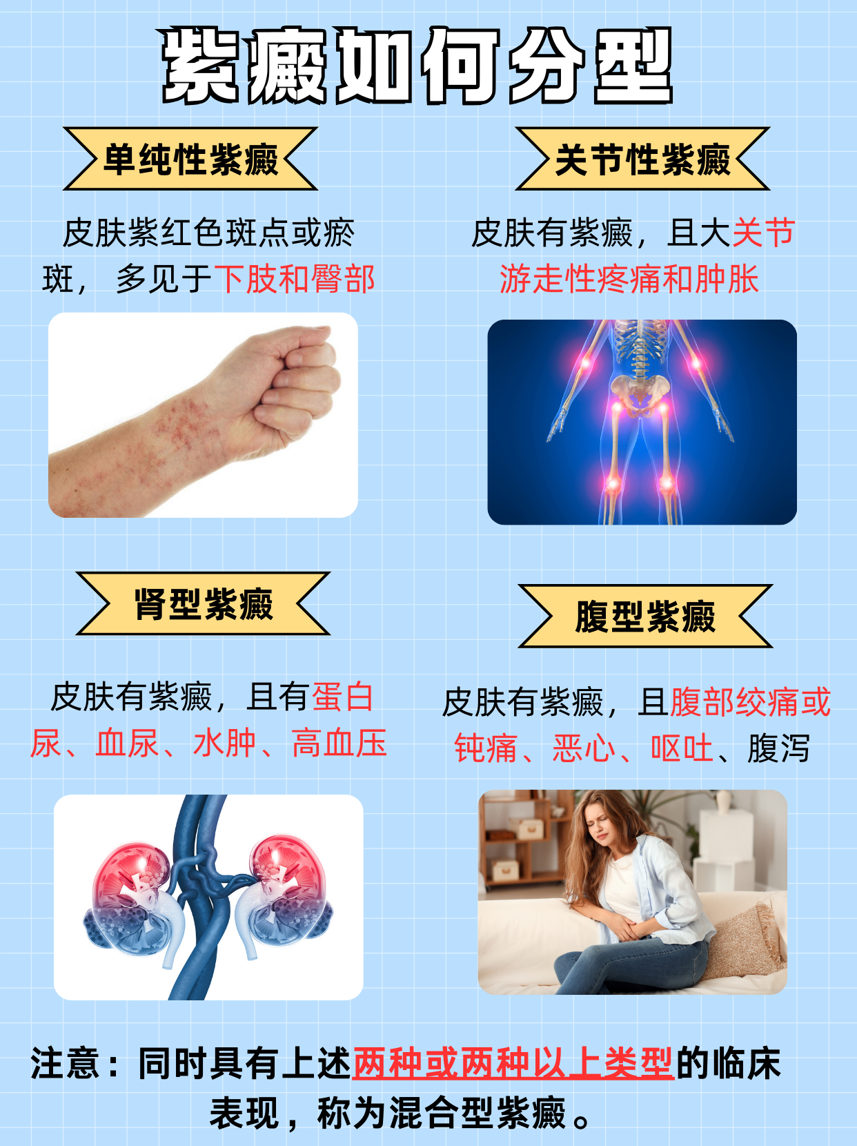 1.单纯性紫癜:这是最常见的类型,通常表现为皮肤出现紫红色斑点或瘀斑,大小不一,多见于下肢和臀部,对称分布。可能会伴有轻微的瘙痒感,但通常没有其他全身症状。