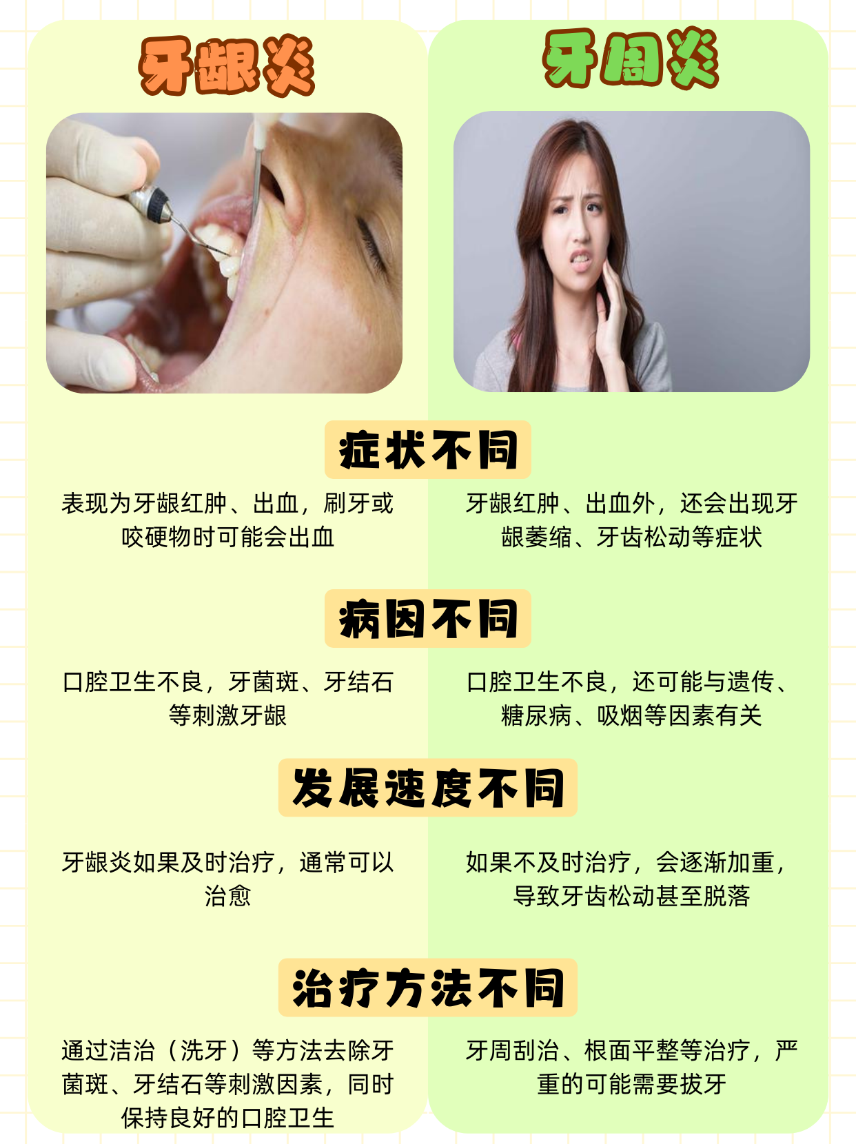3. 发展速度不同:牙龈炎如果及时治疗,通常可以治愈。而牙周炎如果不及时治疗,会逐渐加重,导致牙齿松动甚至脱落。