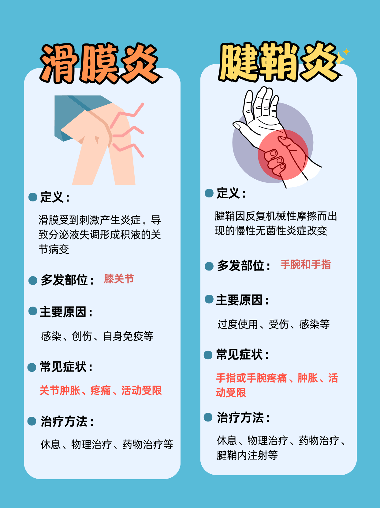 总之,滑膜炎和腱鞘炎是两种不同的疾病,它们的病因、症状和治疗方法也不同。如果出现关节疼痛、肿胀等症状,应及时就医,以便明确诊断并进行相应的治疗。