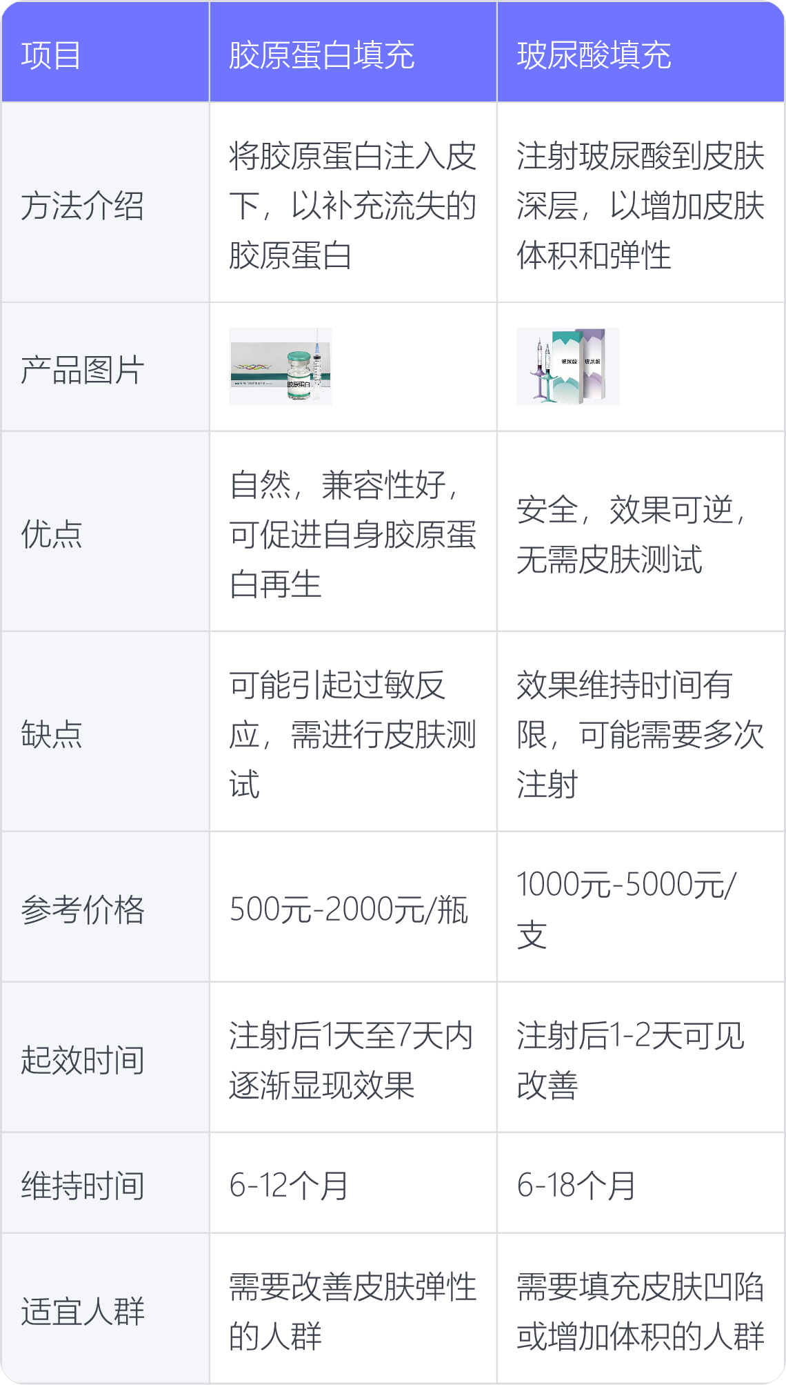 请注意,以上信息是基于一般情况和大多数人的经验总结,具体效果可能因个体差异、产品质量、注射技术等因素而有所不同。在决定使用胶原蛋白或玻尿酸进行填充时,建议咨询专业医生,并根据个人情况和需求进行选择。