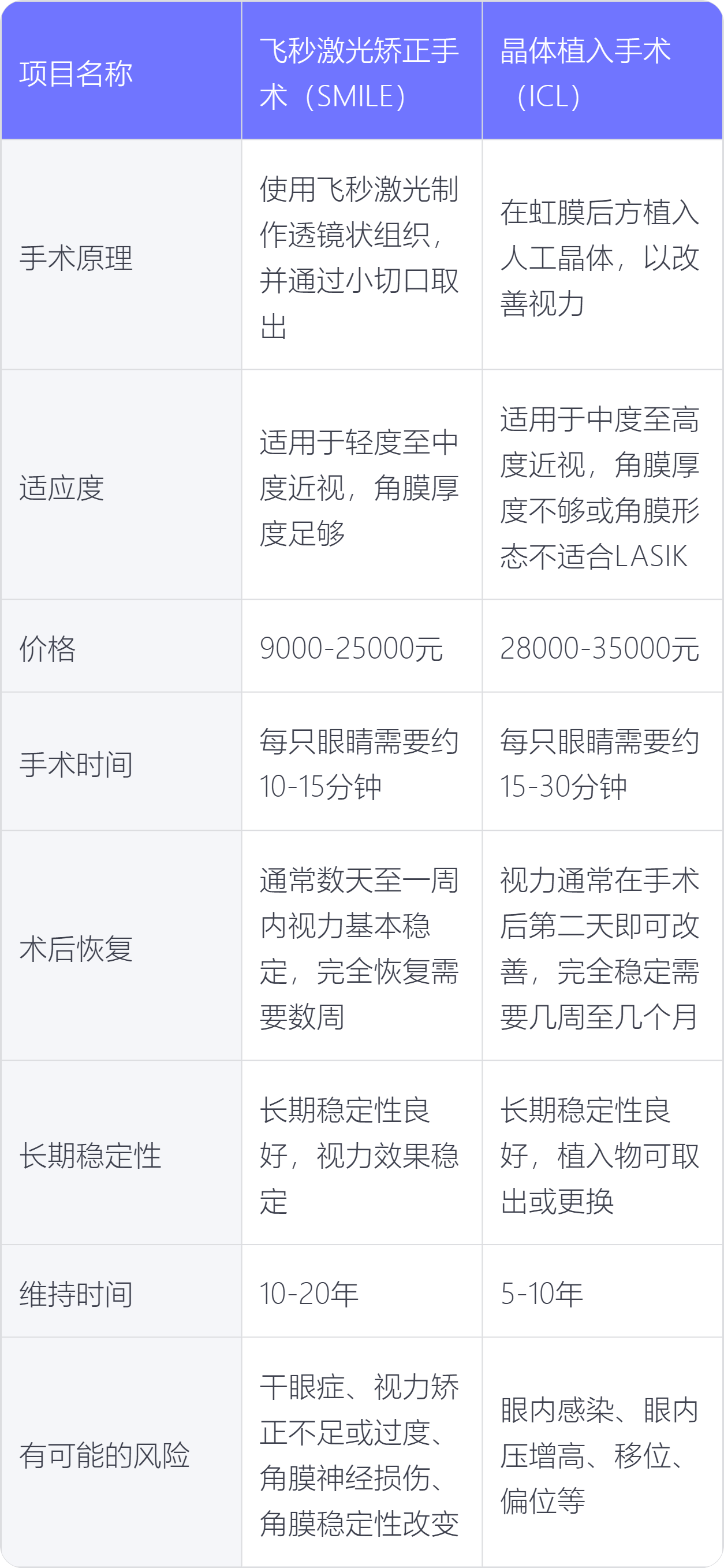 选择飞秒激光矫正手术(SMILE)还是晶体植入手术(ICL)主要取决于个人的视力问题、眼部条件以及个人偏好。两种术式略有不同,建议遵医嘱根据自己的情况做出适合的选择。