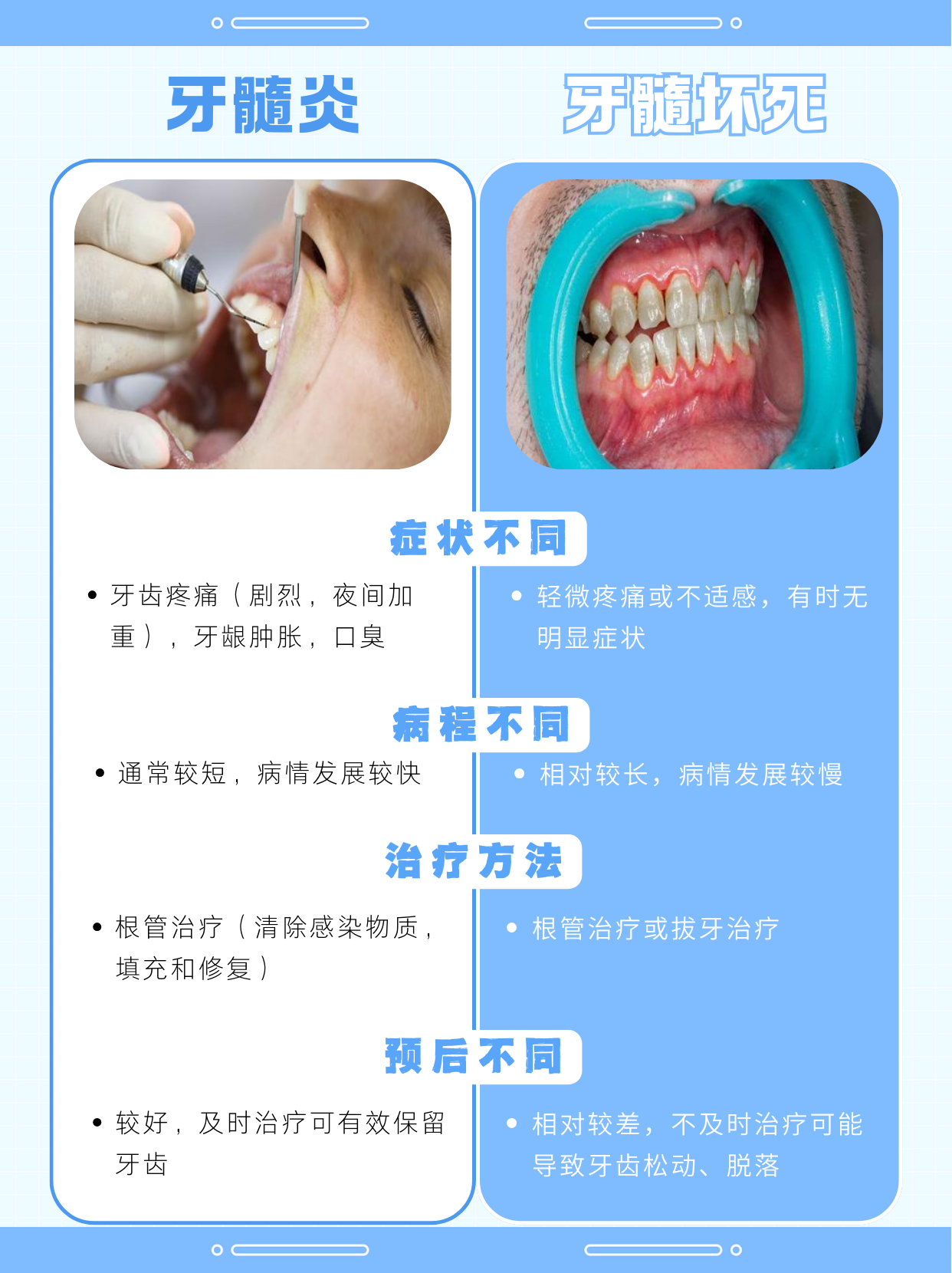 4. 预后不同:牙髓炎的预后通常较好,如果及时治疗,可以有效地保留牙齿。牙髓坏死的预后相对较差,如果不及时治疗,可能会导致牙齿松动、脱落等问题。