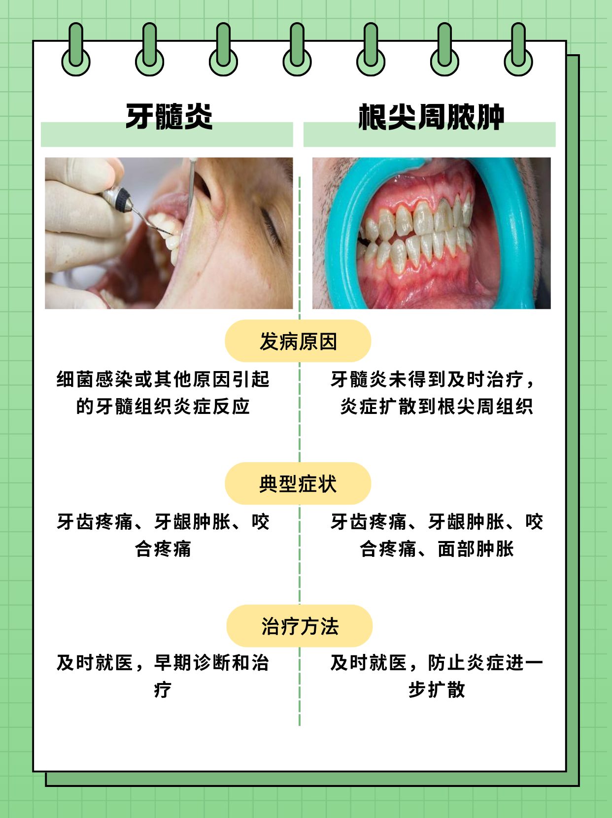 牙髓炎和根尖周脓肿的病因和症状不同,但它们之间存在一定的关系。牙髓炎如果不及时治疗,炎症可能会进一步扩散到根尖周组织,引起根尖周脓肿。
