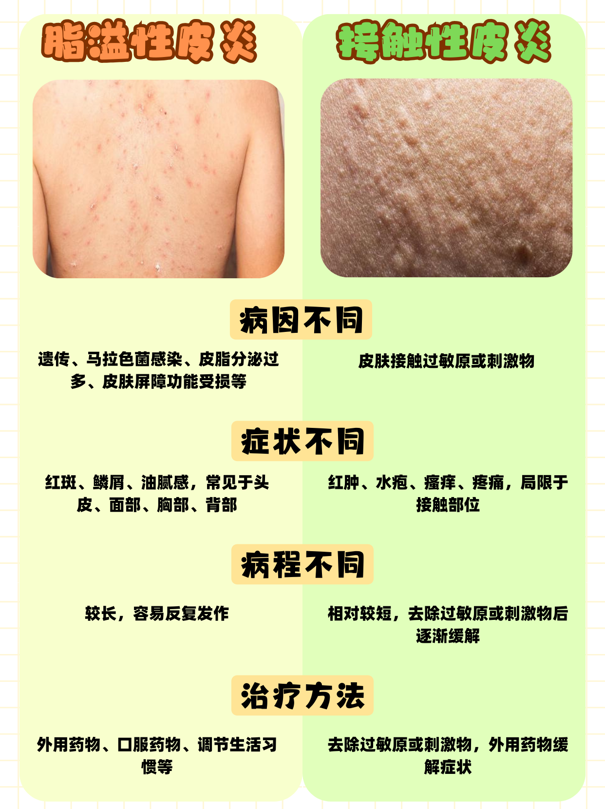 2. 症状不同:脂溢性皮炎主要表现为头皮、面部、胸部、背部等部位的红斑、鳞屑、油腻感等;接触性皮炎则表现为接触部位的红肿、水疱、瘙痒、疼痛等。