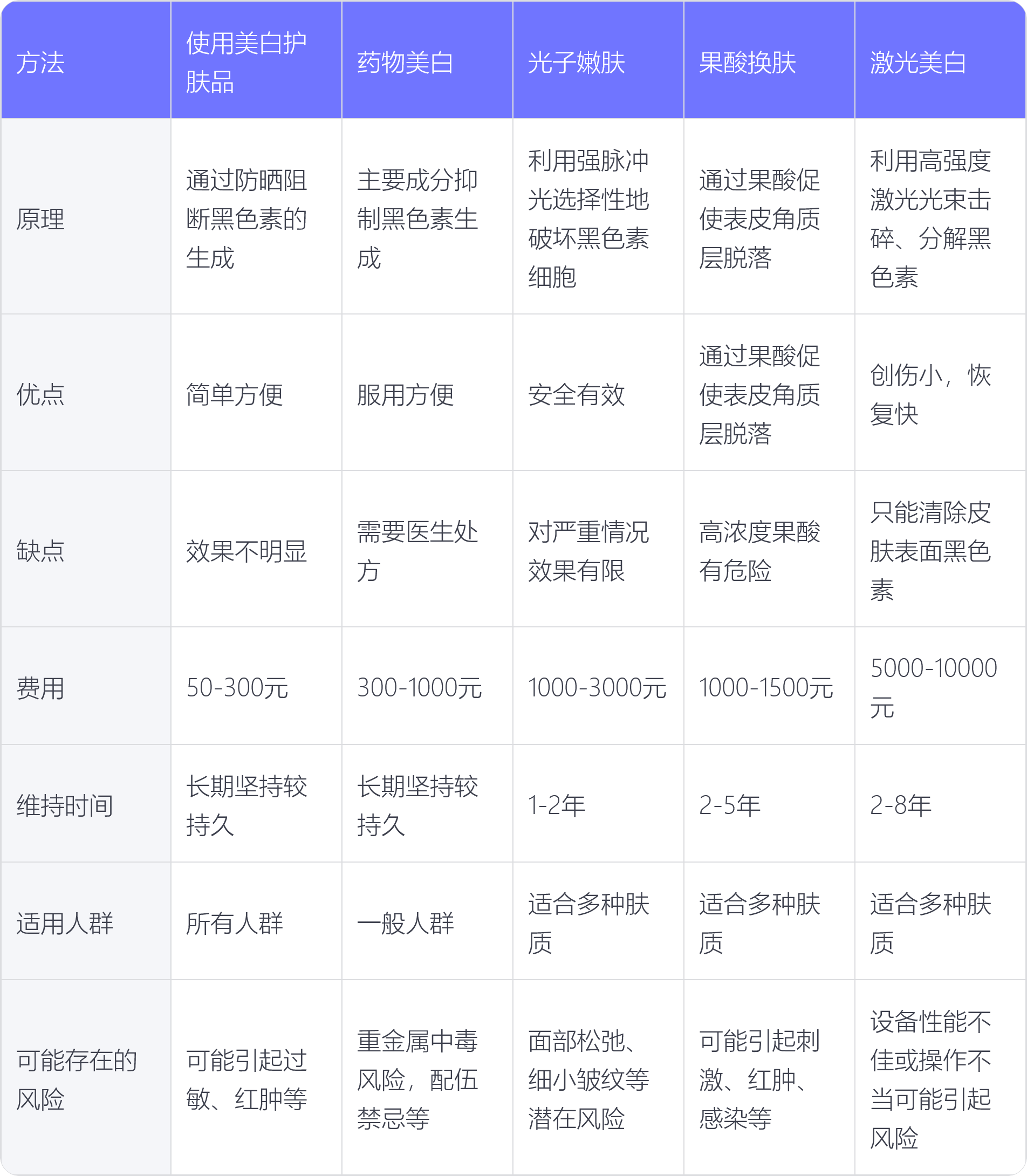 需注意,药物治疗应严格遵照医嘱进行,美白的药物有谷胱甘肽片、烟酰胺片、维生素C片、维生素E软胶囊、氨甲环酸片等。医美方式能快速改善皮肤色泽,但也存在风险和副作用。在选择时,建议根据个人需求、经济状况和医生建议综合考虑。同时,日常防晒和保湿也是保持皮肤白皙的重要环节。