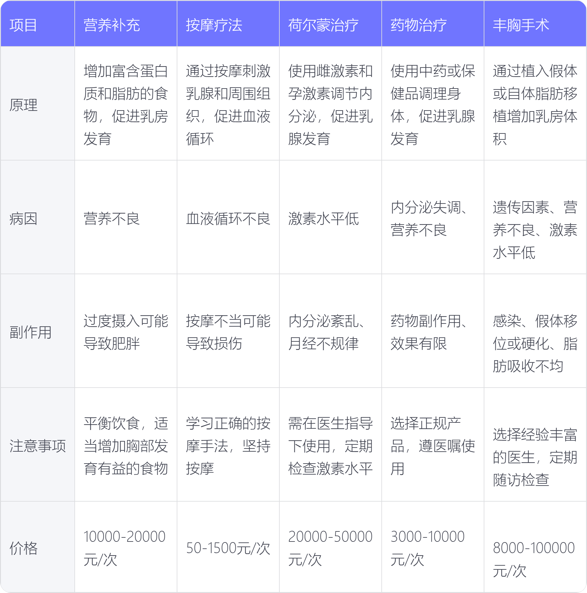一般情况下,胸部发育不良可以通过营养补充、按摩疗法、荷尔蒙治疗、药物治疗、丰胸手术等方法改善。