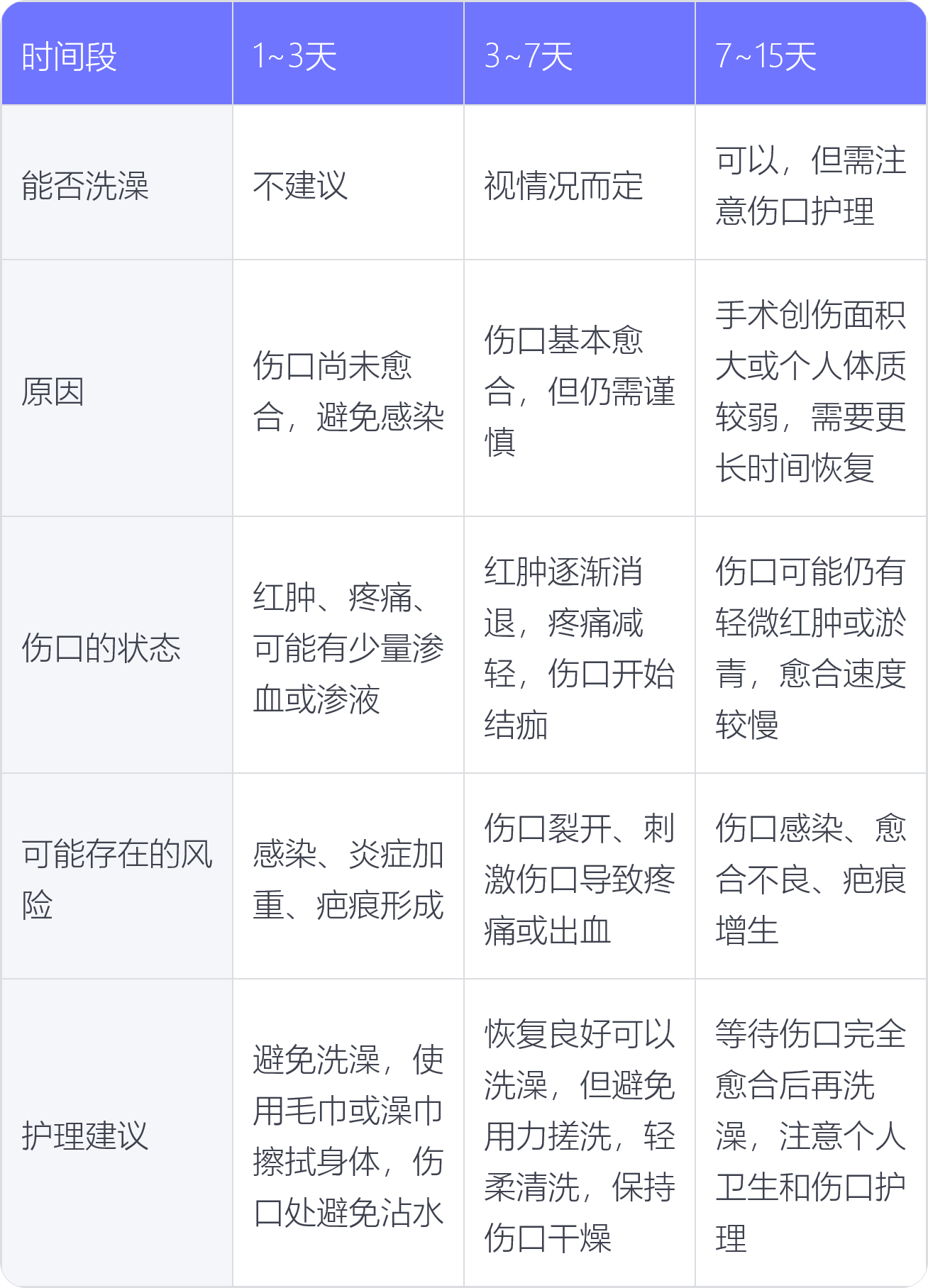 4.恢复情况:伤口的恢复情况是决定洗澡时间的关键因素。如果伤口恢复得快,洗澡的时间就可以相应提前;反之,如果伤口恢复得慢,洗澡的时间就需要推迟。