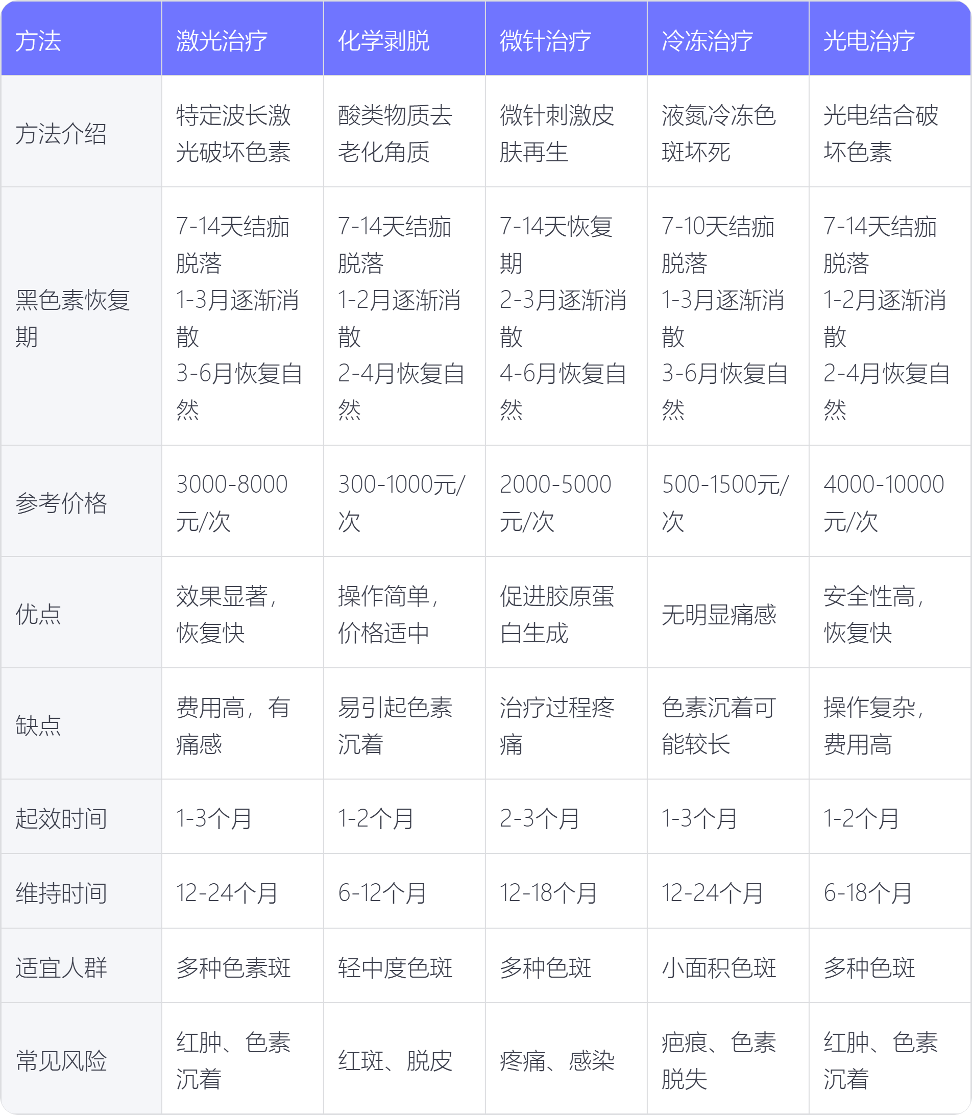点斑后出现的黑色素沉淀是皮肤对治疗的一种正常反应,一般在1-3个月逐渐消退,3-6个皮肤逐渐恢复自然。点斑的常见方法有激光治疗、化学剥脱、微针治疗、冷冻治疗、光电治疗等方法,具体时间可能因治疗方法而异。
