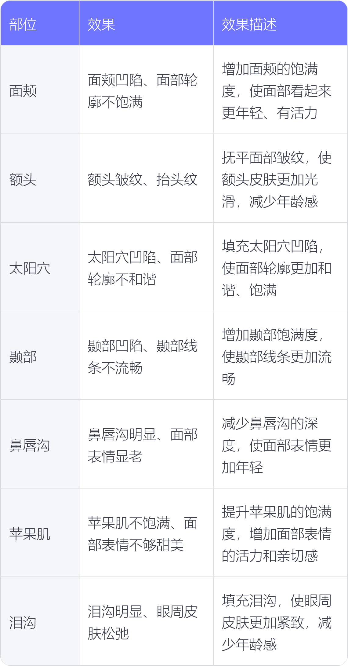 童颜针是一种主要成分为左旋聚乳酸的注射填充剂,具有良好的生物相容性和可降解性。其作用原理是通过刺激自身胶原蛋白增生,来达到抗衰老及紧致提升的作用,从而改善皱纹、紧实肌肤、缩小毛孔,可用于皮肤下陷、松垂区域的填充塑形以及矫正疾病导致的脂肪萎缩,而童颜针注射不同部位会有不同的效果,具体如下: