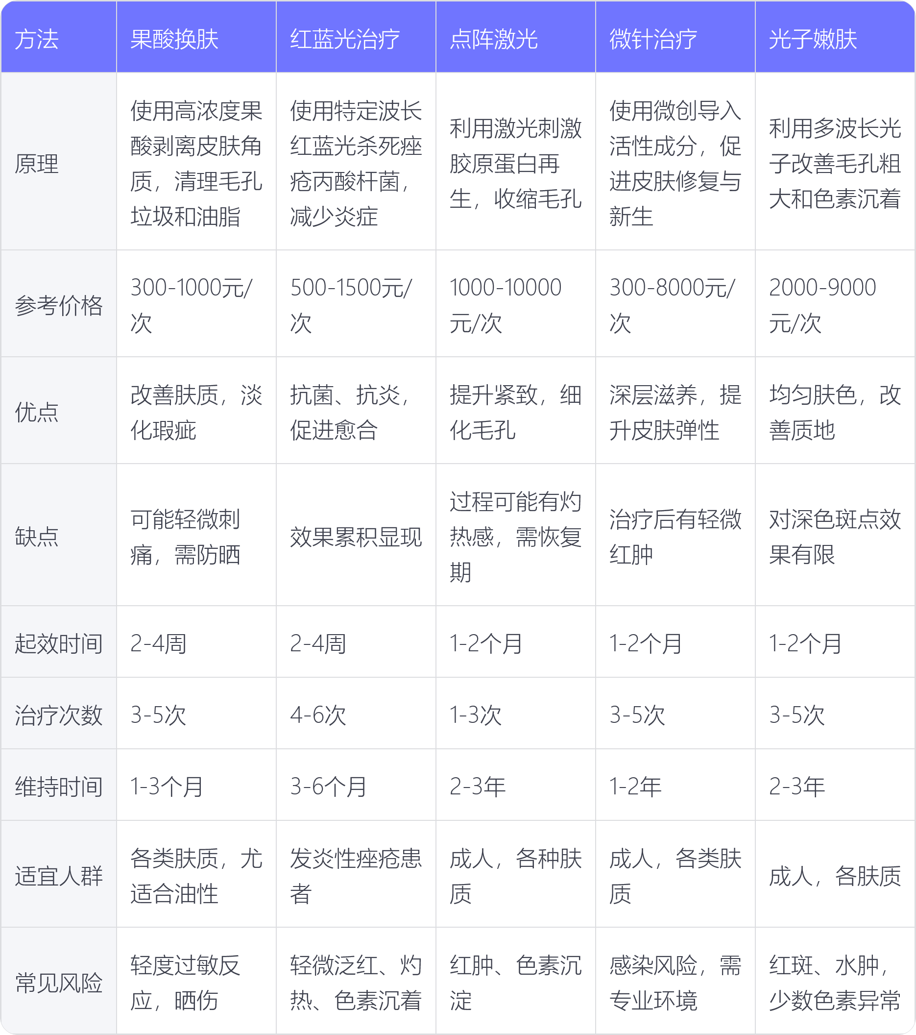 如果日常护理和药物治疗的效果不佳,或者想要快速见效,可以考虑医美方式,包括果酸换肤、红蓝光治疗、点阵激光、微针治疗、光子嫩肤。