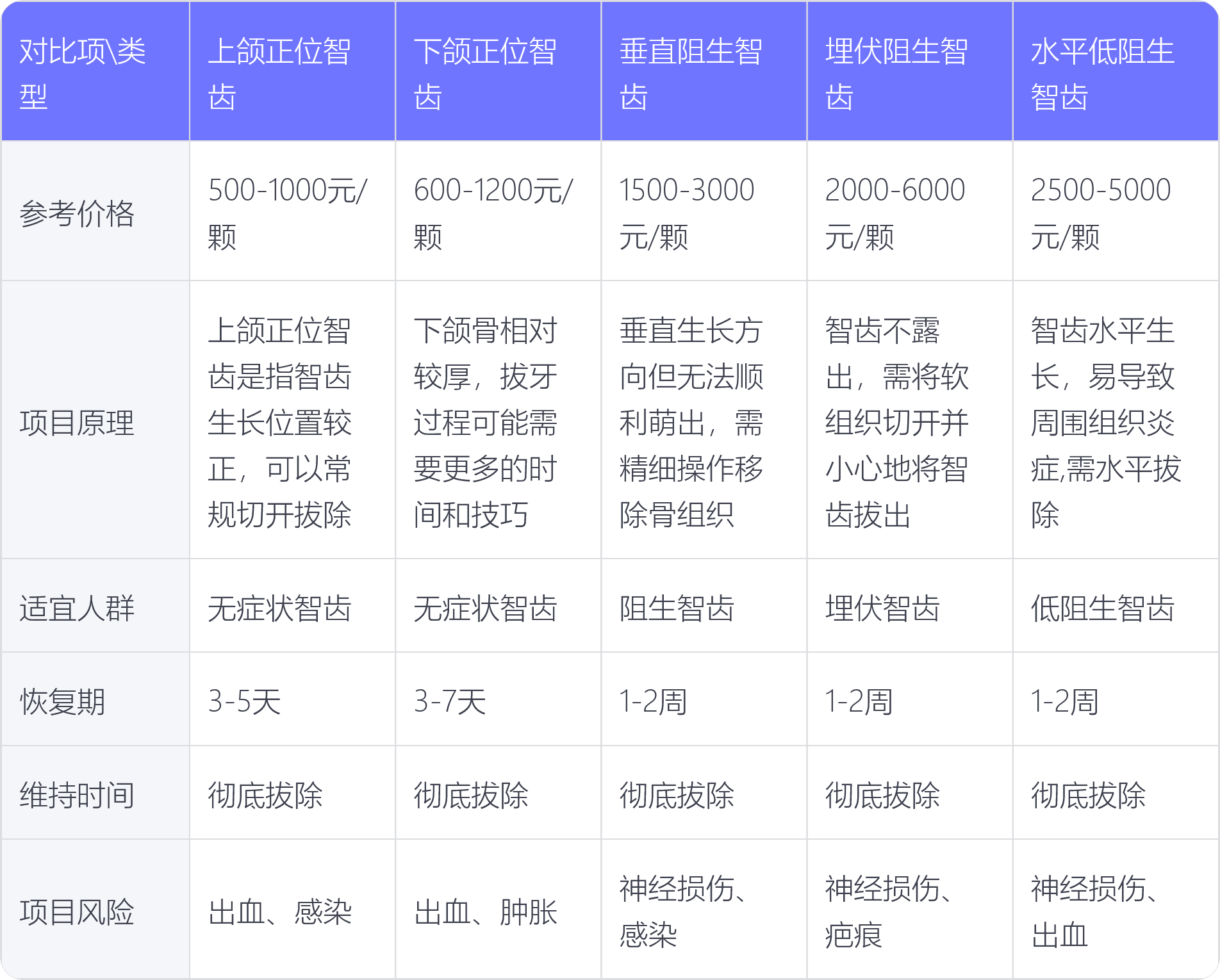 不同类型智齿拔除的价格分析: