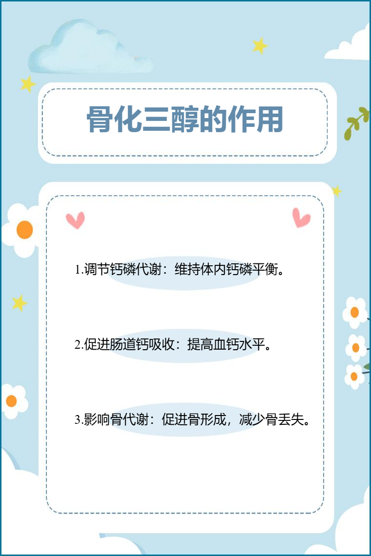 骨化三醇具有调节钙磷代谢、促进肠道钙吸收、影响骨代谢等作用。