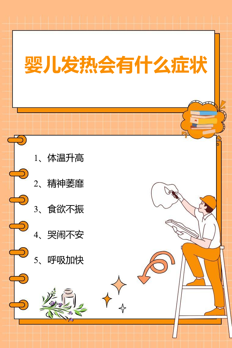 婴儿发热常见症状有体温升高、精神萎靡、食欲不振、哭闹不安、呼吸加快等。