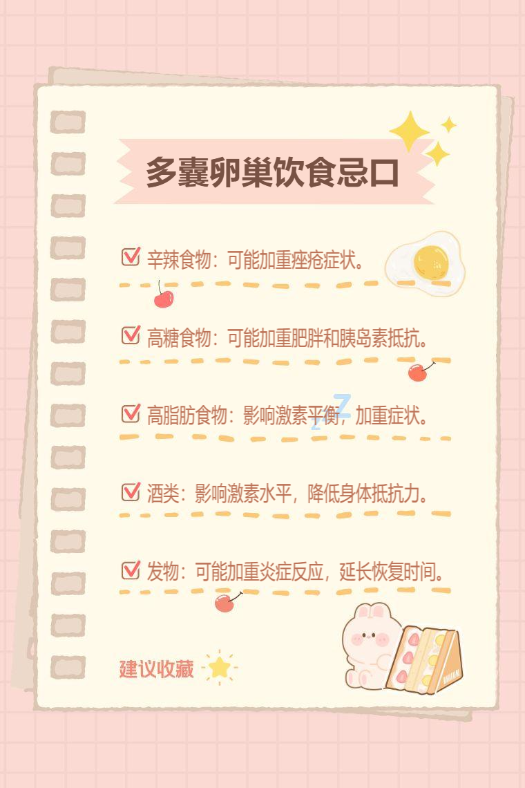 多囊卵巢患者饮食需忌口的食物有辛辣食物、高糖食物、高脂肪食物、酒类、发物等。