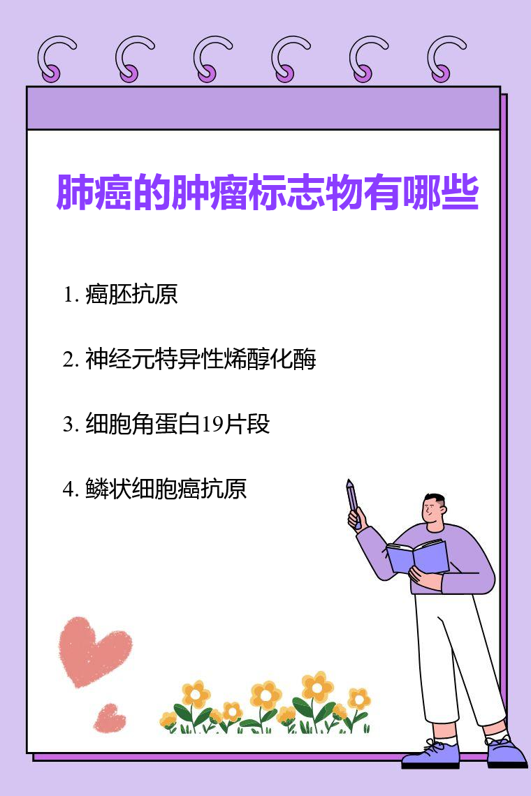 肺癌的肿瘤标志物常见的有癌胚抗原、神经元特异性烯醇化酶、细胞角蛋白19片段、鳞状细胞癌抗原等。