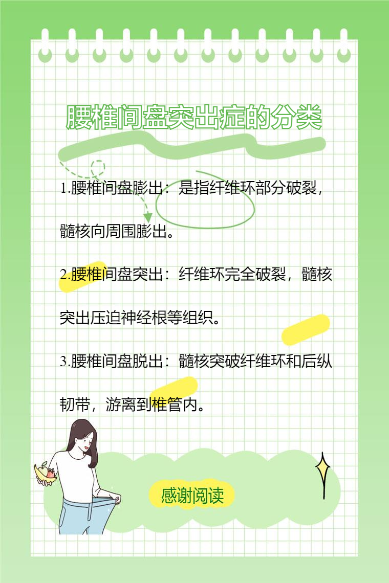 腰椎间盘突出症的分类主要有腰椎间盘膨出、腰椎间盘突出、腰椎间盘脱出等。