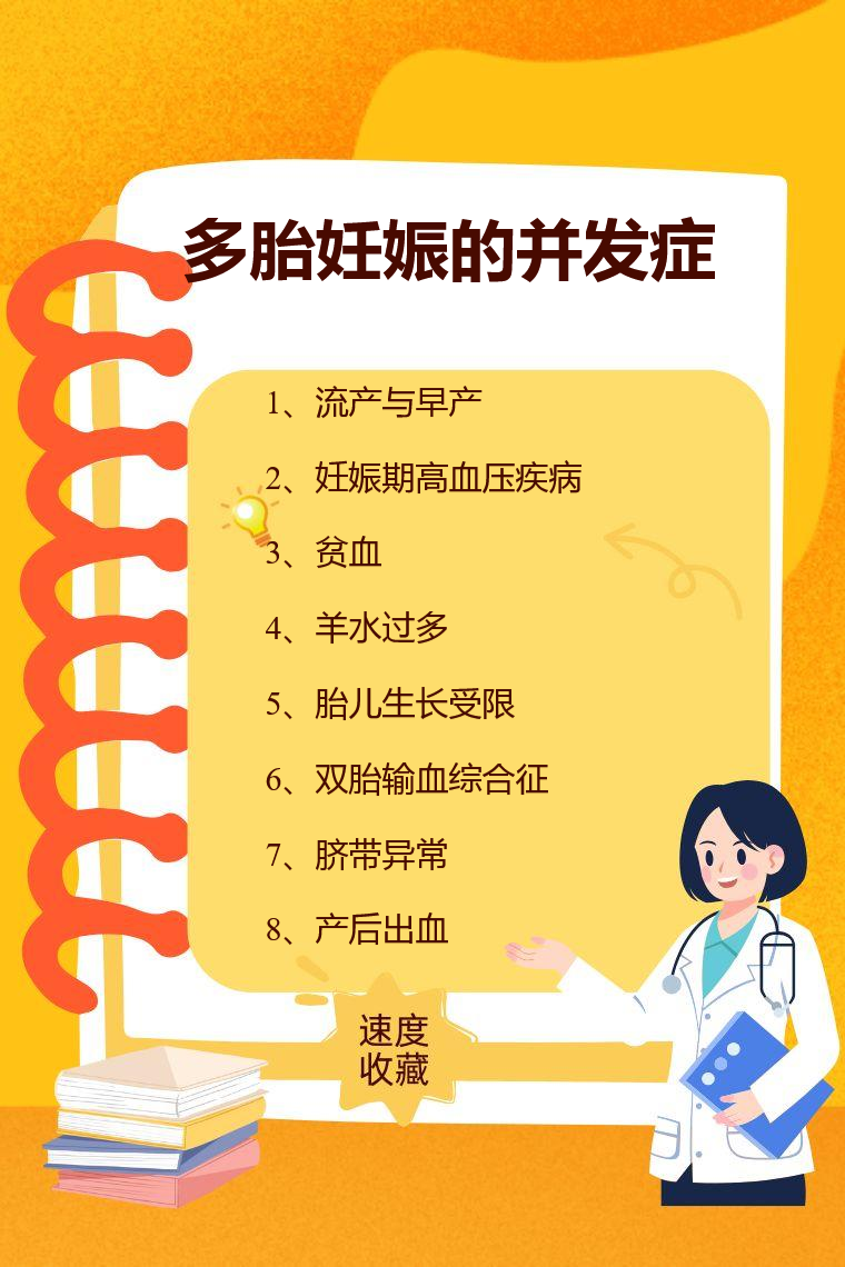 多胎妊娠的并发症主要包括流产与早产、妊娠期高血压疾病、贫血、羊水过多、胎儿生长受限、双胎输血综合征、脐带异常、产后出血等。