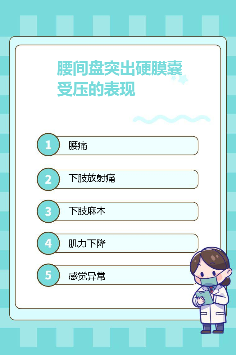 腰间盘突出硬膜囊受压的表现主要有腰痛、下肢放射痛、下肢麻木、肌力下降、感觉异常等。