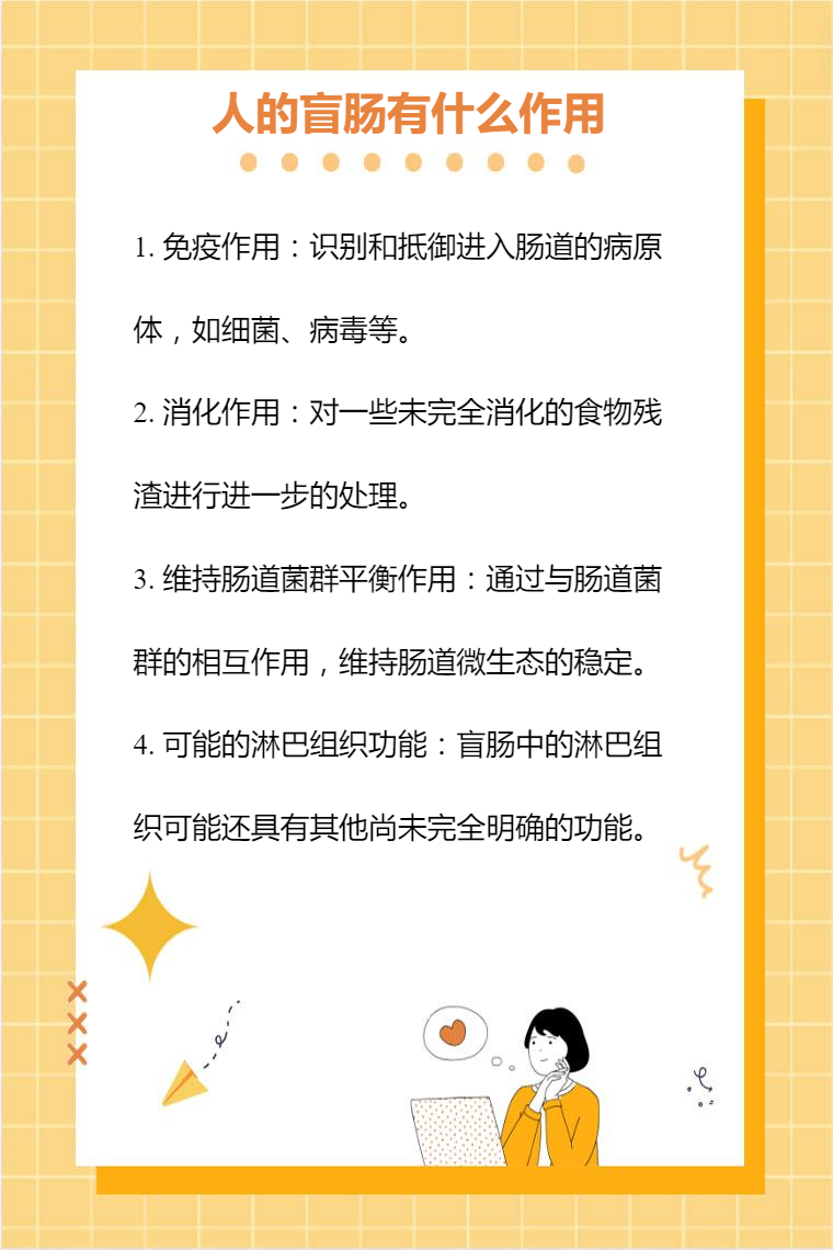 人的盲肠作用主要有免疫作用、消化作用、维持肠道菌群平衡作用、可能的淋巴组织功能等。