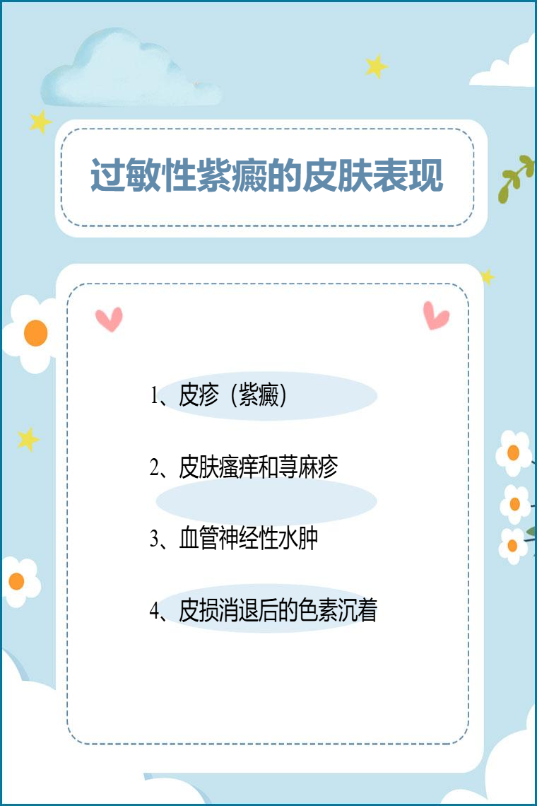 过敏性紫癜的皮肤表现主要包括皮疹(紫癜)、皮肤瘙痒和荨麻疹、血管神经性水肿、皮损消退后的色素沉着等。