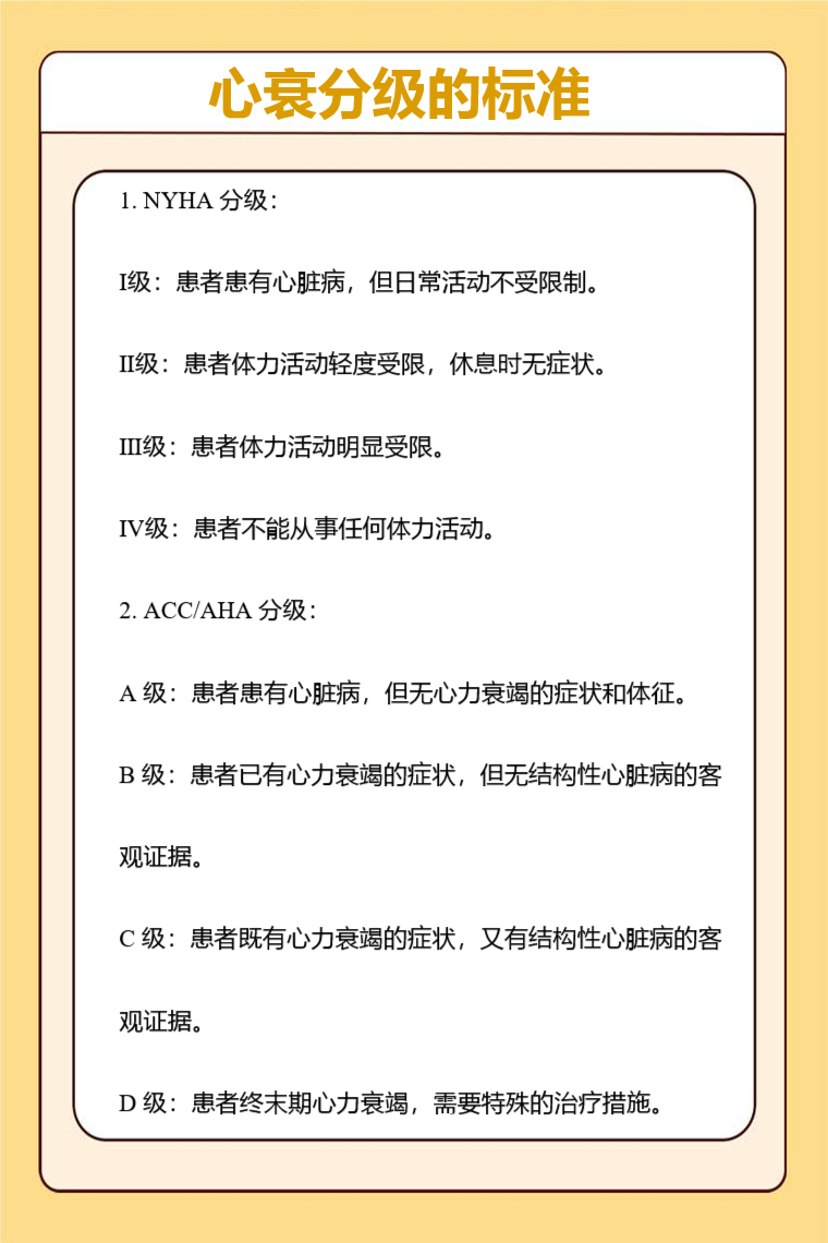 心衰分级的标准主要用于评估心力衰竭的严重程度,以便制定合适的治疗方案和监测病情进展。常见的心衰分级标准有纽约心脏病协会NYHA分级、美国心脏病学会ACC/美国心脏协会AHA分级等。以下是详细内容: