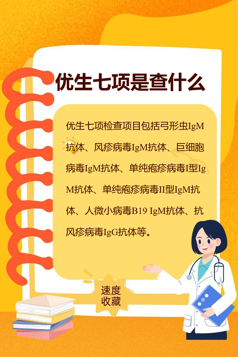 优生七项检查项目包括弓形虫IgM抗体、风疹病毒IgM抗体、巨细胞病毒IgM抗体、单纯疱疹病毒I型IgM抗体、单纯疱疹病毒II型IgM抗体、人微小病毒B19 IgM抗体、抗风疹病毒IgG抗体等。