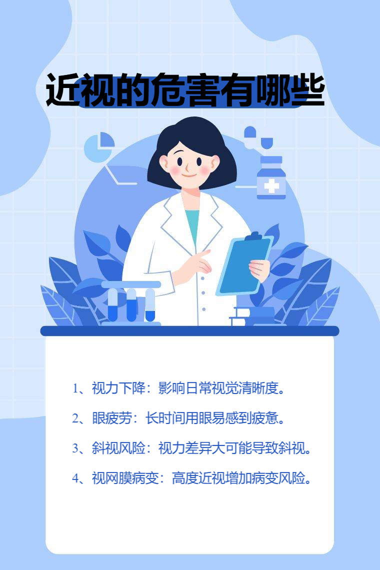 1. 视力下降:这是近视最常见的危害,患者看远处物体模糊不清,影响日常生活和学习。尤其是在需要远距离视物的情况下,如开车、看黑板等,会给工作和学习带来很大不便。