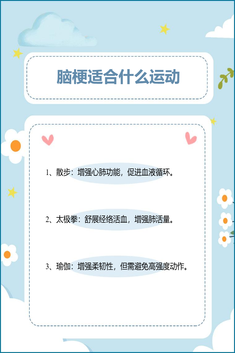 脑梗适合的运动有散步、太极拳、瑜伽等。