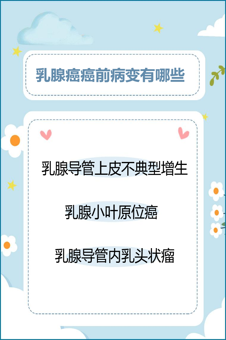 乳腺癌癌前病变常见的有乳腺导管上皮不典型增生、乳腺小叶原位癌、乳腺导管内乳头状瘤等。
