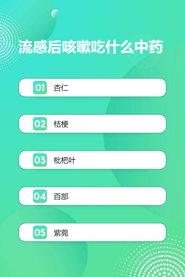 流感后咳嗽可选用的中药有很多,如杏仁、桔梗、枇杷叶、百部、紫菀等。